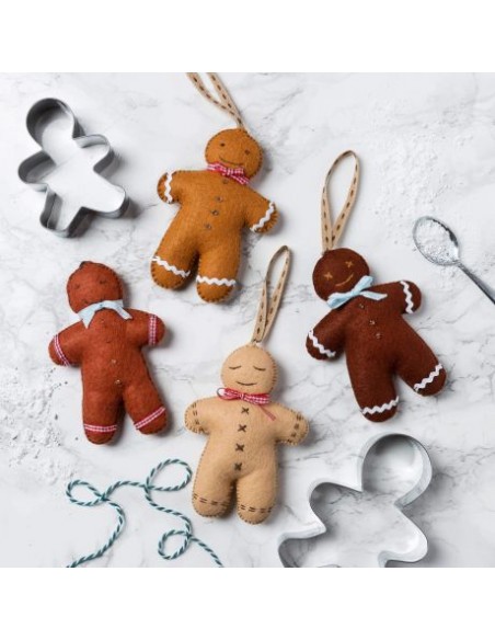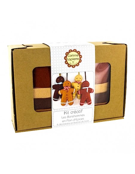 Kit feutrine de la créatrice Corinne Lapierre, présenté dans une boîte en carton recyclé, pour réaliser 4 bonhommes en pain d'épices à suspendre.