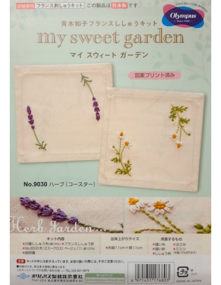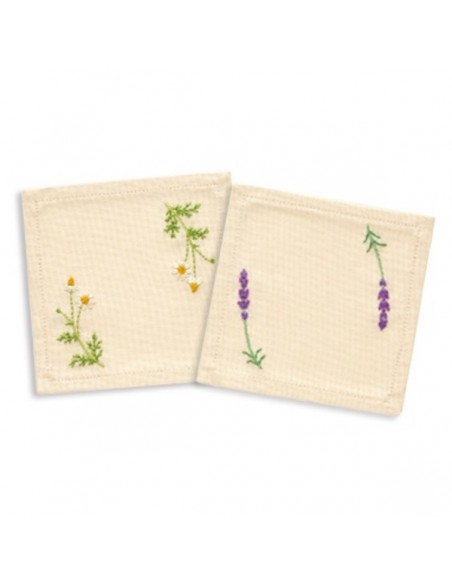 Kit de broderie traditionnelle pour réaliser deux dessous de verre* brodés de brins de lavande et de marguerites délicates.