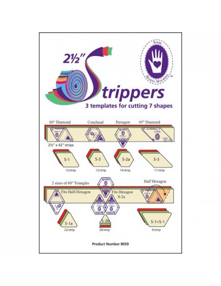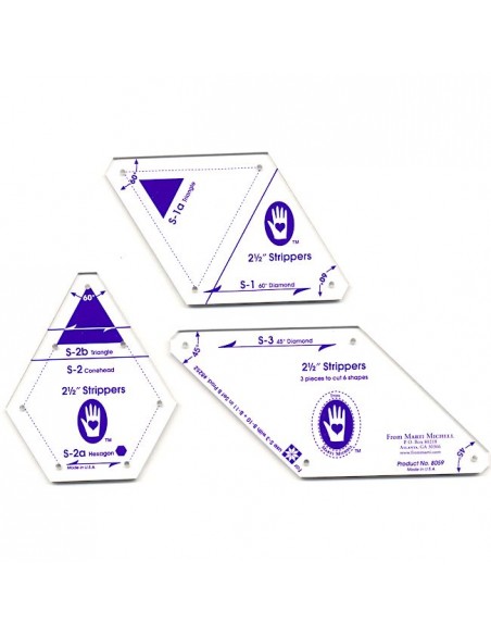 Ces 3 gabarits vous permettront de découper 7 formes différentes dans vos bandes de tissu de 2 1/2 inches (soit 6.4 cm de large) pour une utilisation optimisée de tous vos rouleaux de tissus (Jelly Rolls, Design Rolls, Bali Pops...) et éviter les chutes!