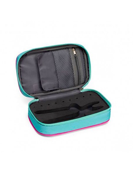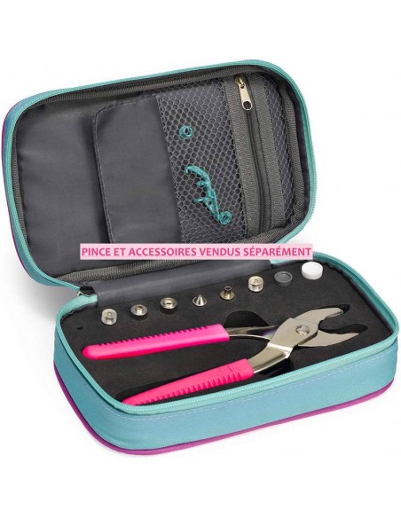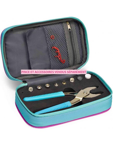 Jolie trousse conçue pour ranger la pince "VARIO" de Prym ainsi que les petits accessoires (matrices, embouts...) grâce au compartiment en mousse découpée et aux deux petites poches intérieures.
