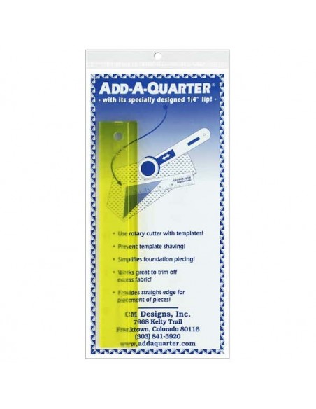 Très pratique lorsque vos gabarits de patchwork ne comptent pas la marge de couture, la règle "Add-A-Quarter" dispose d'un rebord épais de 1/4" de largeur qui permet d'obtenir facilement la marge de couture!