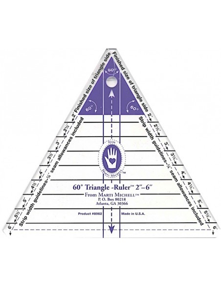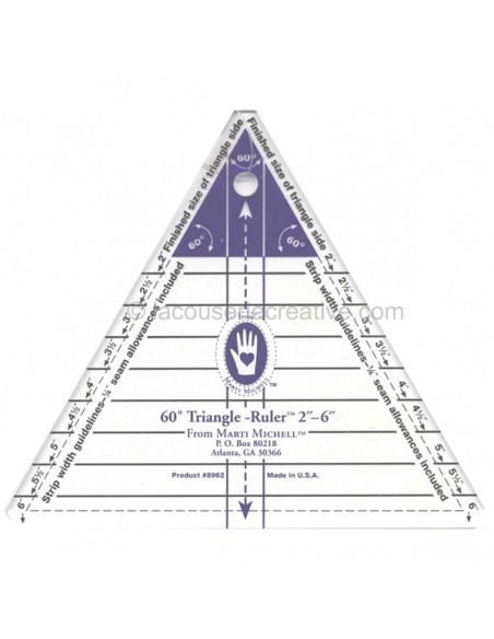 Règle de patchwork en forme de triangle équilatéral avec angles de 60°. La hauteur de vos triangles pourra varier de 5 cm à 15 cm environ (de 2" à 6").